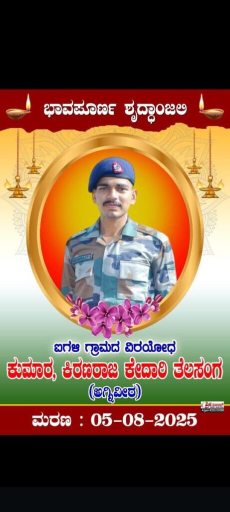 ಚಿಕ್ಕೋಡಿ: ಭಾರತೀಯ ಸೇನೆಯಲ್ಲಿ ಸೇವೆ ಸಲ್ಲಿಸುತ್ತಿದ್ದ ಬೆಳಗಾವಿ ಜಿಲ್ಲೆಯ ಅಥಣಿ ತಾಲ್ಲೂಕಿನ ಐಗಳಿ ಗ್ರಾಮದ ಕಿರಣರಾಜ ಕೇದಾರಿ ತೆಲಸಂಗ ( 23) ಆಗ್ನಿವೀರ ಯೋಧ ಮಂಗಳವಾರ ಮುಂಜಾನೆ ಪಂಜಾಬ್ ನಲ್ಲಿ ಕರ್ತವ್ಯದಲ್ಲಿದ್ದಾಗ ಹೃದಯಾಘಾತದಿಂದ ನಿಧನ ಹೊಂದಿದ್ದು ಇಂದು ಮೃತದೇಹ ಸ್ವಗ್ರಾಮಕ್ಕೆ ಬರಲಿದೆ.